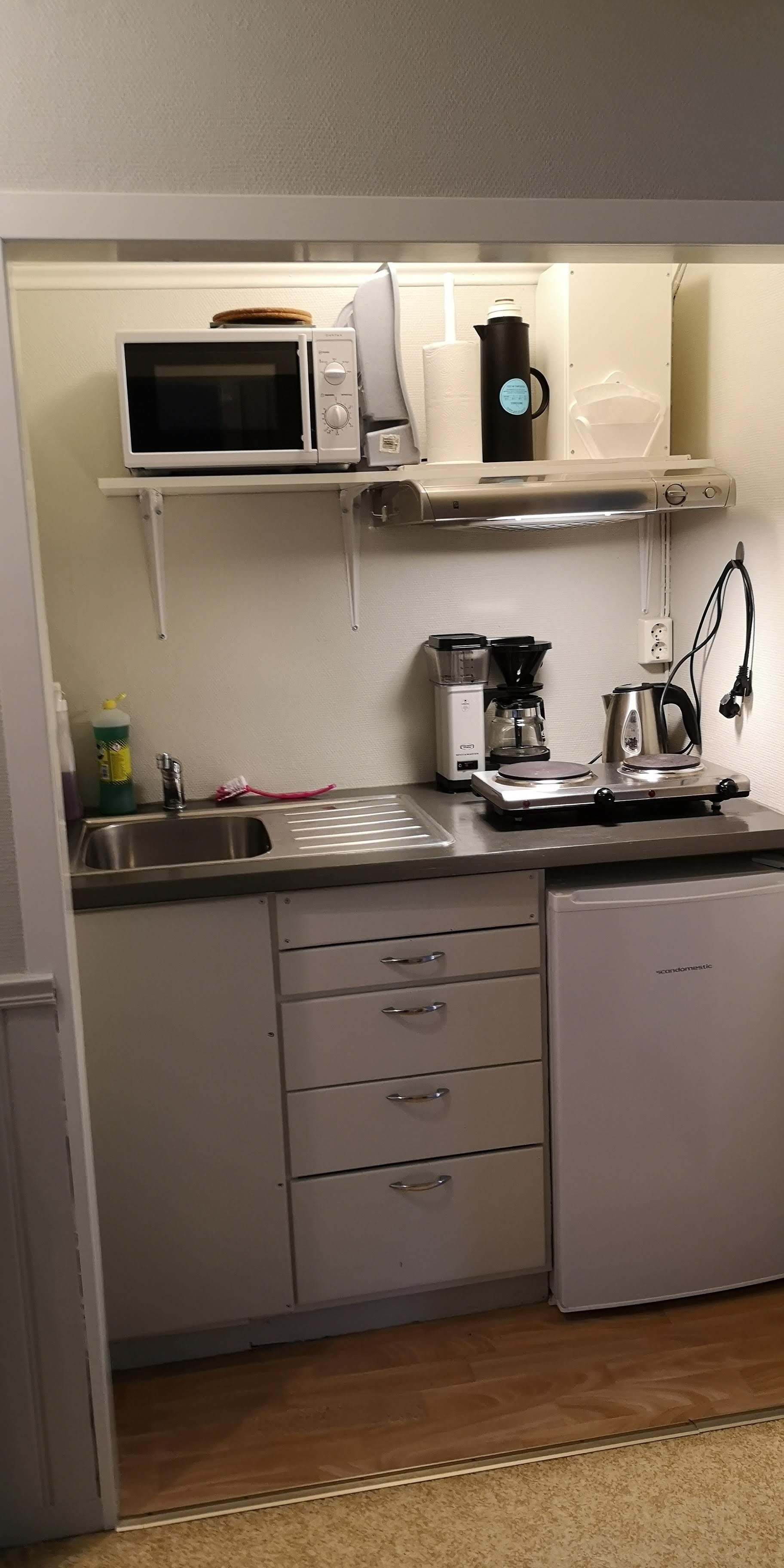 I kjøkkenkroken er det to kokeplater, mikrobølgeovn (ikke steikeovn), kaffetrakter, vannkoker og et kjøleskap. Der er alt du trenger for enkel matlaging og dekketøy for fire personer. Det er også gratis Wifi for våre gjester