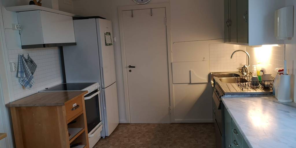 Fyrkafé med stort oppholdsrom og stort felleskjøkken: